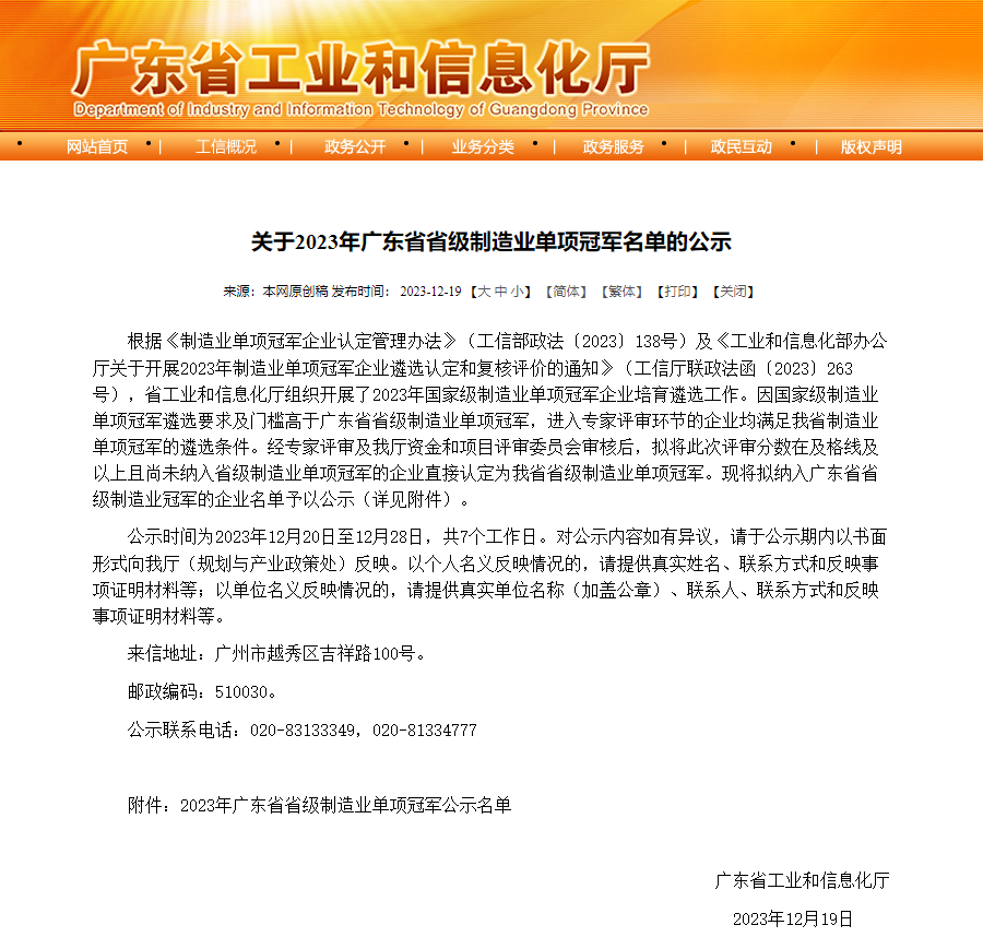 333tiyu.com高能荣获“2023年广东省制造业单项冠军”